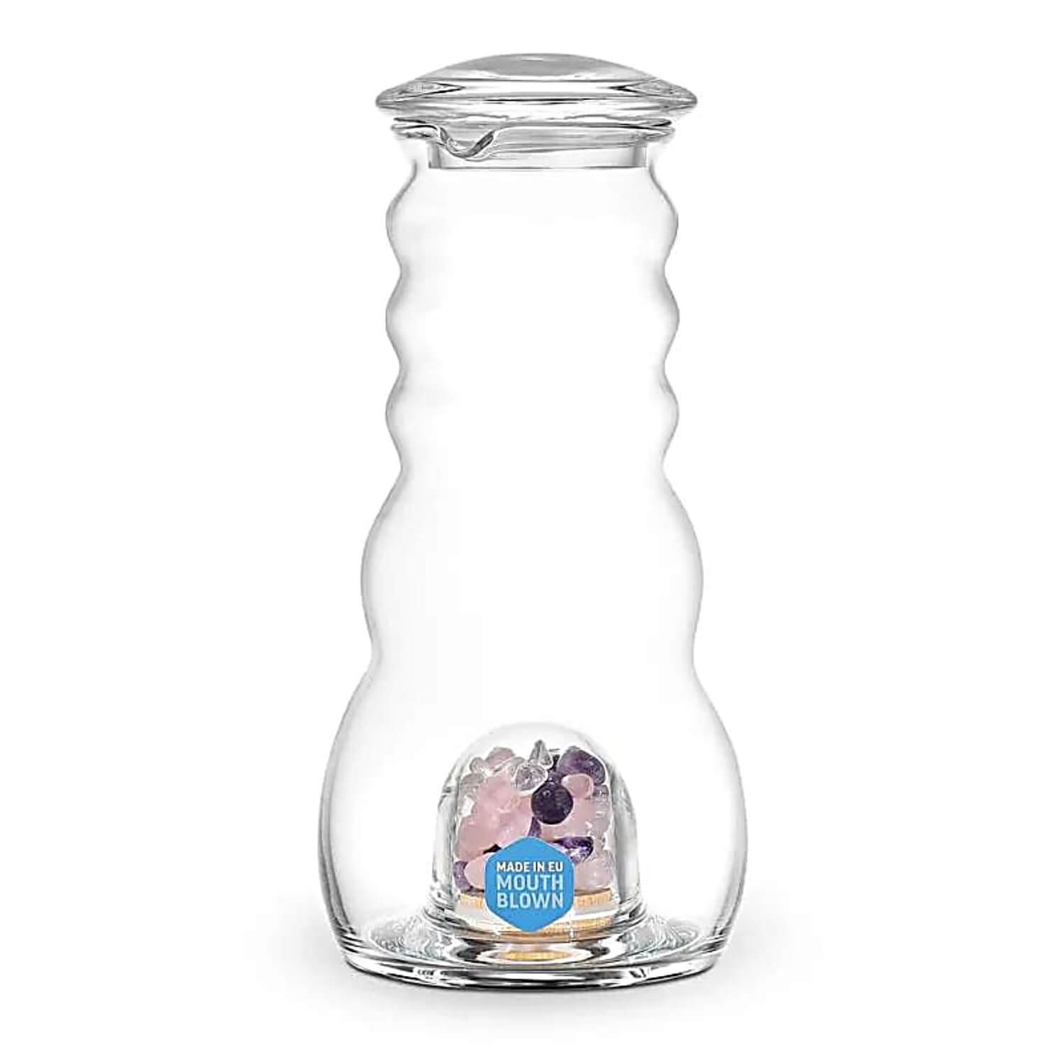 Dzięki precyzyjnie wyprofilowanej formie, zaprojektowanej z myślą o złotej proporcji, karafka jest dopasowana swym delikatnym kształtem do zasad złotego prostokąta. Posiada na dnie pojemniczek, w którym można umieścić minerały, służące do energetyzowania wody. Jednocześnie daje on efekt powiększania kamieni, co wspaniale podkreśla ich piękno.
