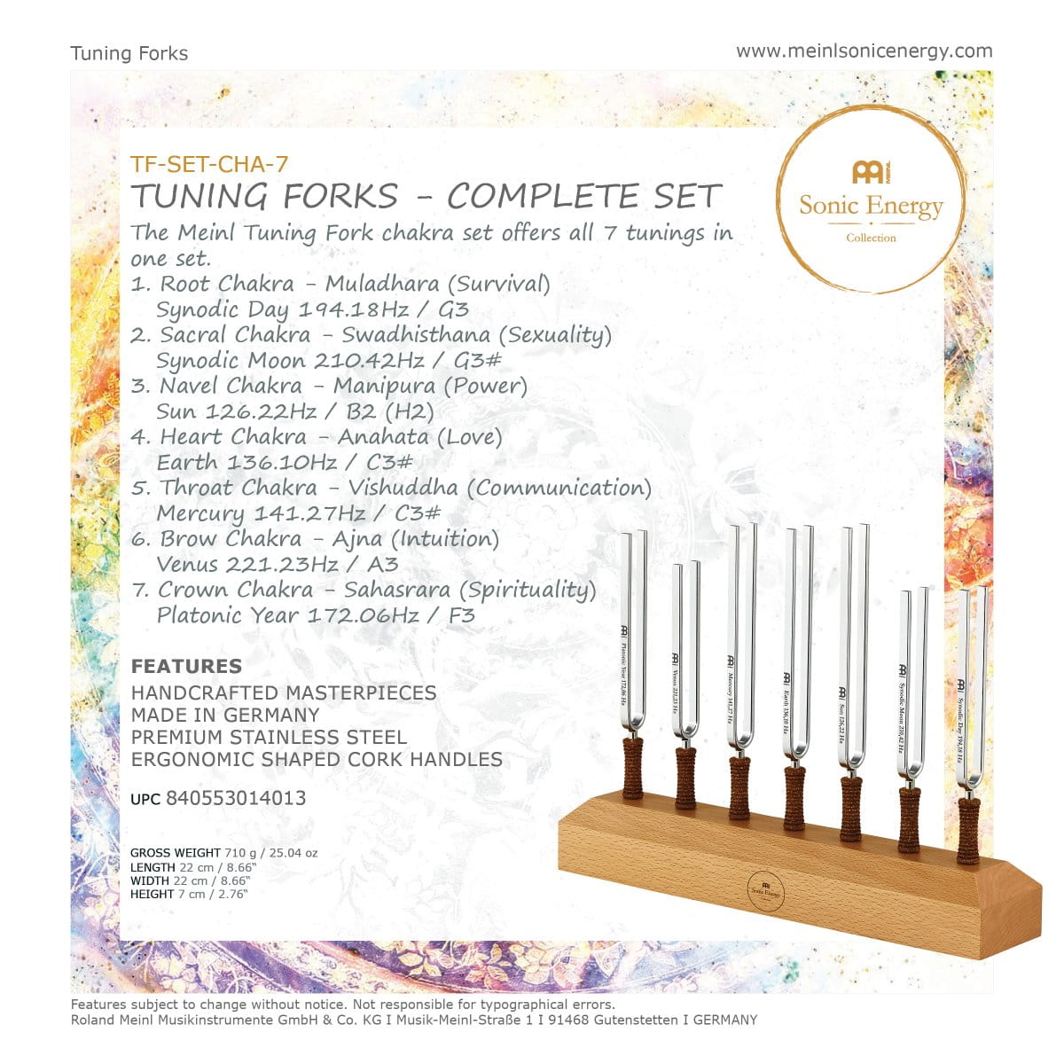 Pięknie wykonany, stalowy kamerton Czakry Serca, któremu odpowiada częstotliwość Ziemi - 136,10 Hz. Kamertony planetarne MEINL są produkowane przy użyciu obliczeń Hansa Cousto (dotyczących tzw. Kosmicznej Oktawy), w celu właściwego dopasowania częstotliwości Słońca, Księżyca i planet. Każdy z nich jest dostrojony tak, aby wytwarzał odpowiednią częstotliwość ciała niebieskiego. Kamertony z tej serii zostały zaprojektowane do zastosowania w celach terapeutycznych.
