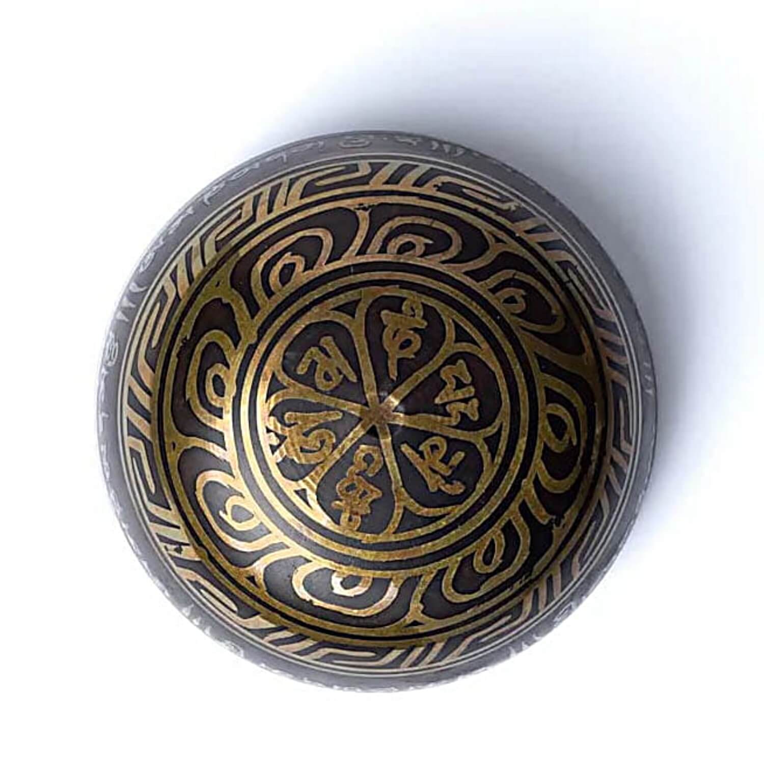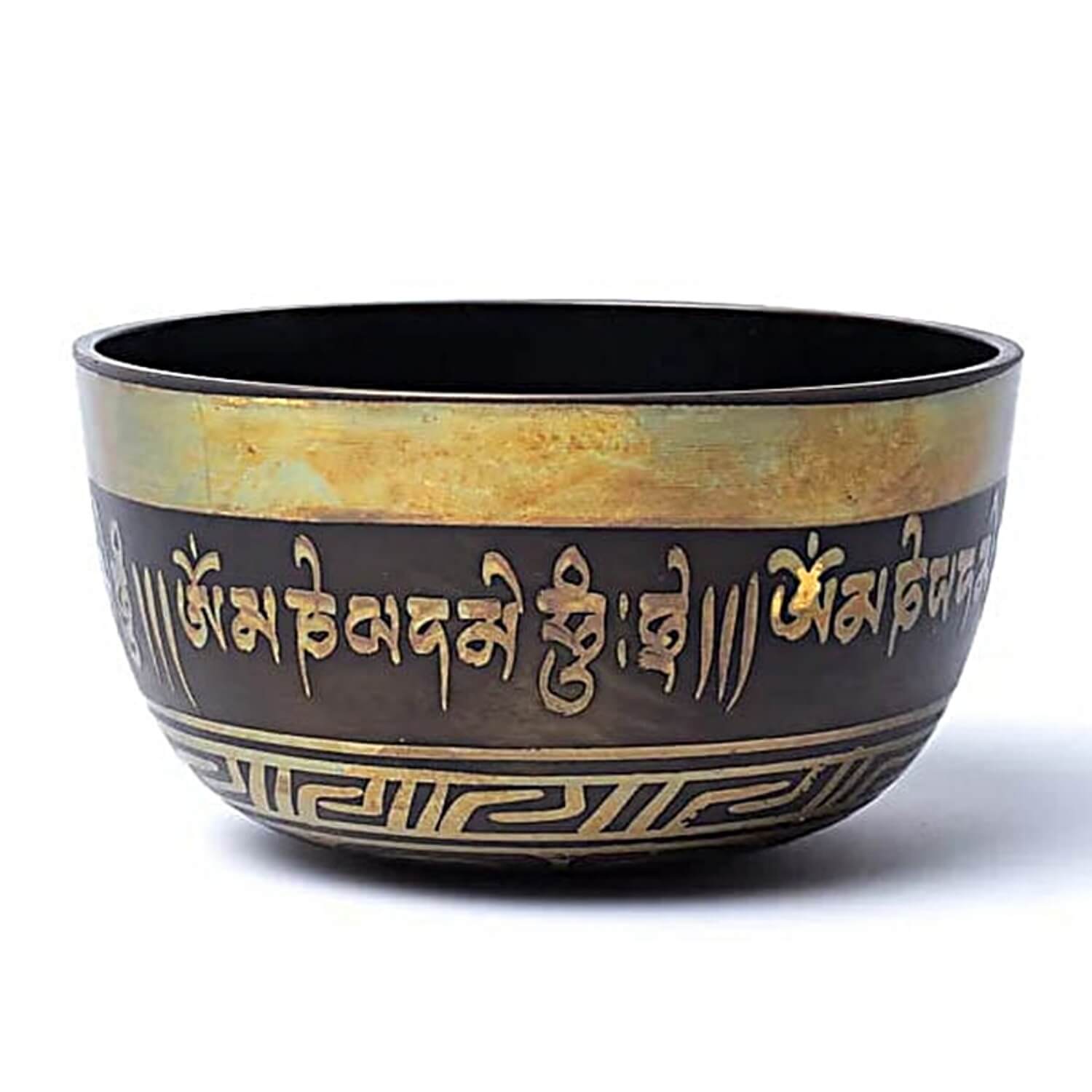 Tradycyjna, tybetańska misa śpiewająca z Nepalu, ręcznie grawerowana. Jest pięknie ozdobiona mantrą Om Mani Padme Hum, zarówno wewnątrz, jak i na zewnątrz. Posiada czysty dźwięk z bogatą paletą alikwotów.