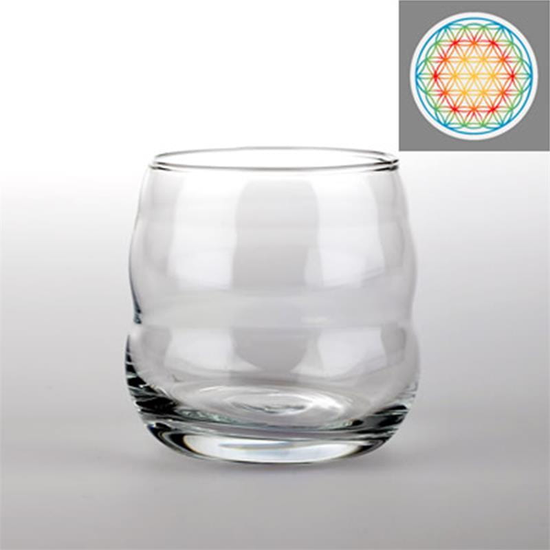 Konstrukcja subtelnie i elegancko zaokrąglonego kształtu szklanki Mythos opiera się na Złotym Podziale. Wewnątrz niej lśni kolorowo Kwiat Życia, dodający temu, co pijemy, pozytywnej energii.
