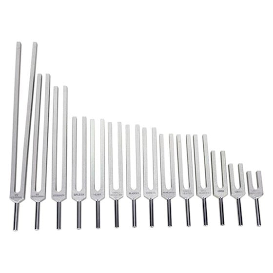 Zestaw 15 kamertonów do uzdrawiania dźwiękiem ludzkich narządów. Te kamertony są dostrojone do częstotliwości tkanek zdrowych ludzkich narządów, krwi, kości i mięśni.